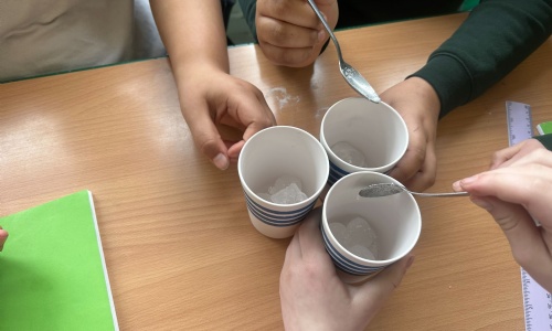 Today, Year 6 took part in a science investigation to celebrate Science Week. The children explored the variables that affect how quickly ice melts. Working in groups, they placed ice cubes into three separate bowls: one with salt, one with sugar, and one with nothing added. They then timed how long it took for the ice to melt in each bowl.